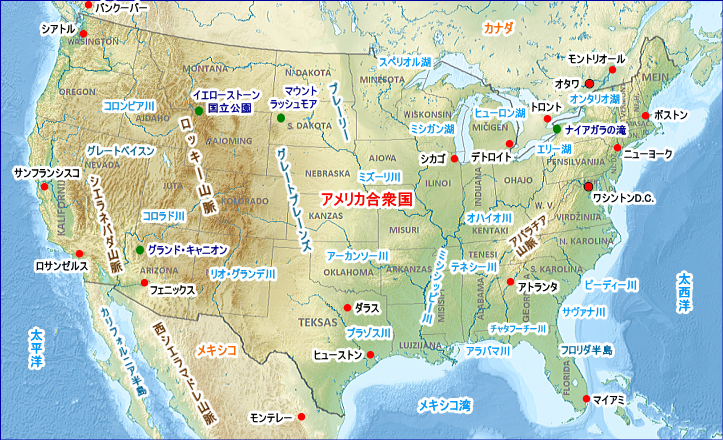 | アメリカ合衆国 州名、人口、面積、州都 | アメリカ合衆国 主要都市、人口 | アメリカ合衆国 河川地図 | |||