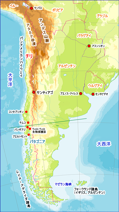 南アメリカ南部西岸、太平洋に面する国。