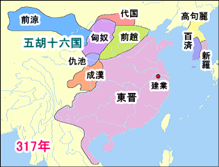| 春秋五覇 秦(BC778-BC206年)の穆公(在位BC659-BC621年) 楚(BC1100-BC223年)の荘王(在位BC614-BC591年) 斉(BC1046-BC221年)の桓公(在位BC685-BC643年) 宋(BC1100年-BC286年)の襄公(在位BC651-BC637年) 晋(BC1100-BC376年)の文公(在位BC636-BC628年) BC403年、下剋上により、晋から韓・魏・趙 の三国が独立。 |