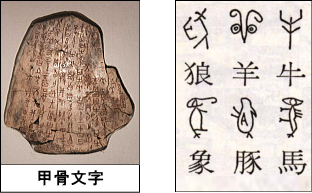 また、この時代には、精緻な青銅器や占いに使用された甲骨文字(亀甲や獣骨などに刻まれた文字)が
