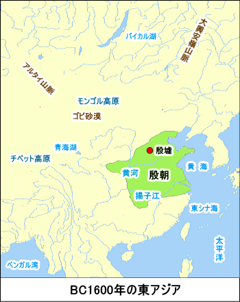 河南省北西部を中心とした殷(いん)(BC1600-BC1046年)とされている。