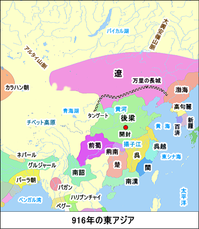 907年、朱全忠(在位 907-912年)は唐を倒して後梁を建国したが、すぐにほかの勢力に取って代わられ、
