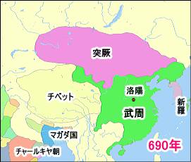 子の中宗、弟の睿宗(えいそう)を次々に廃位し、やがて690年、国号を周に改め、中国史上初の