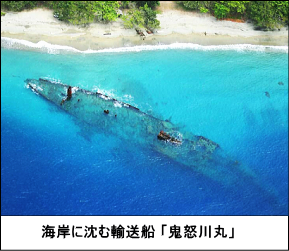 兵士や物資を揚陸するために砲撃の中を浜に乗り上げた日本の輸送船「鬼怒川丸」、