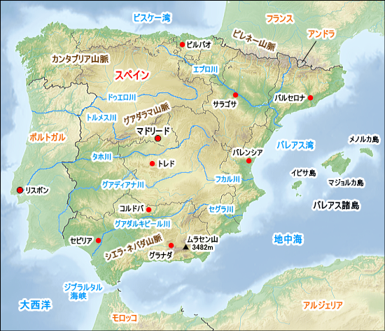 国土の大部分は標高600~700mの高原で、北部にピレネー、