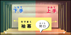 | 「袖」は、舞台の端の上手と下手の客席から見えない部分を指す。舞台の両端に吊った「袖幕」で、舞台裏の物(照明機材やスタンバイしているセット、出演者、スタッフなど)が客に見えてしまうのを防ぐもの。また客席から見たときの横幅を間口(まぐち)という。袖幕の位置を調節することによって、舞台の間口も変化する。 | |