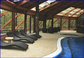 ログ風の客室は全13室で、中にはプールもあって快適。自然を感じながら