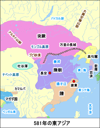 581年、北周の皇帝から禅譲という形で隋を建国すると、589年、南朝の陳を滅ぼし、中国を統一した。