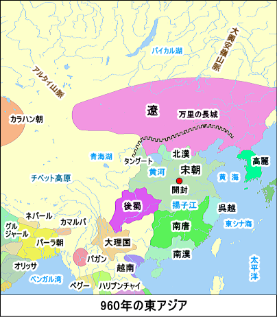 対外的には、北方に勃興した遼(916-1125年)と、11世紀中期以降、西方で勢力を