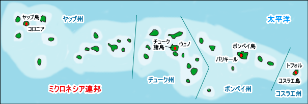 西太平洋のヤップ州、チューク州、ポンペイ州、コスラエ州と