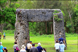 古代ポリネシアの遺跡で、3つの大きな石灰岩による鳥居のような建造物。